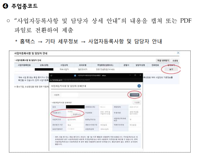 * 간이과세자 사업장의 경우 하기 주업종코드에 대한 내역을 캡처하여 제출하여야 합니다!